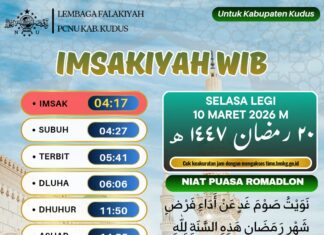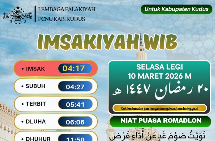 KUDUS, Suaranahdliyin.com - Jadwal Imsakiyah untuk Wilayah Kudus, 19 Ramadan 1447 H/ 9 Maret 2026.