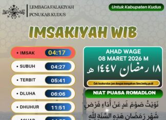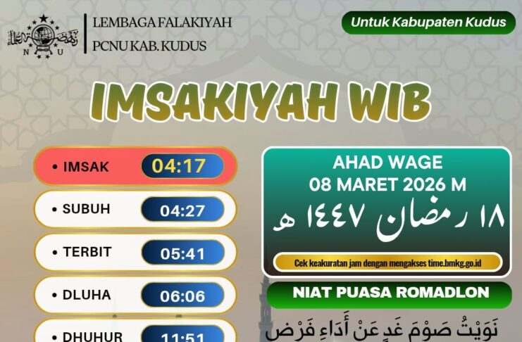 KUDUS, Suaranahdliyin.com - Jadwal Imsakiyah untuk Wilayah Kudus, 17 Ramadan 1447 H/ 7 Maret 2026.
