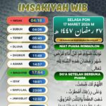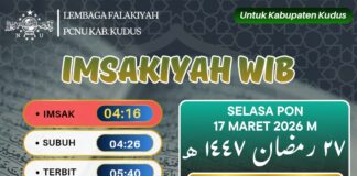 KUDUS, Suaranahdliyin.com – Buat umat Islam di Kabupaten Kudus dan sekitarnya, berikut jadwal imsakiyah untuk Wilayah Kabupaten Kudus, 27 Ramadan 1447 H/ 17 Maret 2026.