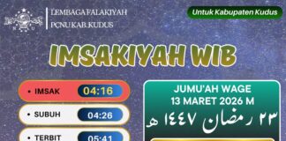 KUDUS, Suaranahdliyin.com – Buat umat Islam di Kabupaten Kudus dan sekitarnya, berikut jadwal imsakiyah untuk Wilayah Kabupaten Kudus, 21 Ramadan 1447 H/ 11 Maret 2026.