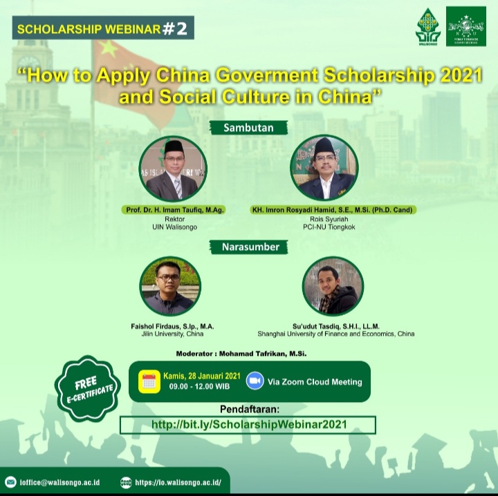 SEMARANG, Suaranahdliyin.com – International Office UIN Walisongo Semarang bekerja sama dengan Pengurus Cabang Istimewa Nahdlatul Ulama (PCINU) Tiongkok, akan menyelenggarakan Scholarship Webinar #2 bertajuk “How to Apply China Government Scholarship 2021 and Social Culture in China”.