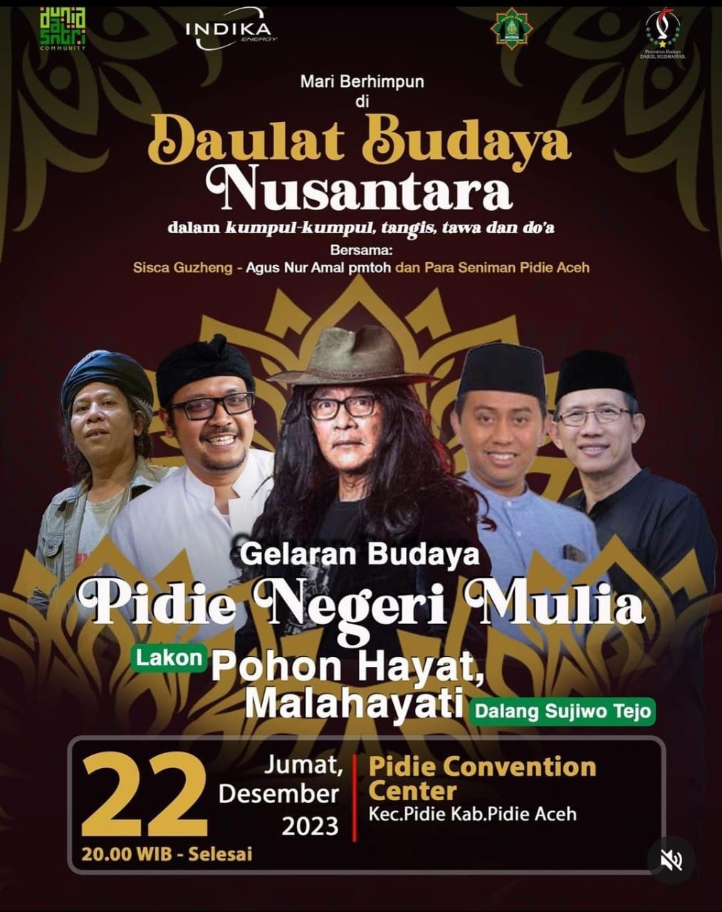 Pagelaran budaya kali ini menampilkan pertunjukan seni budaya dengan judul besarnya Pidie Negeri Mulia dan lakon yang dibawakan oleh Ki Dalang Sujiwo Tejo adalah Pohon Hayat Malahayati.