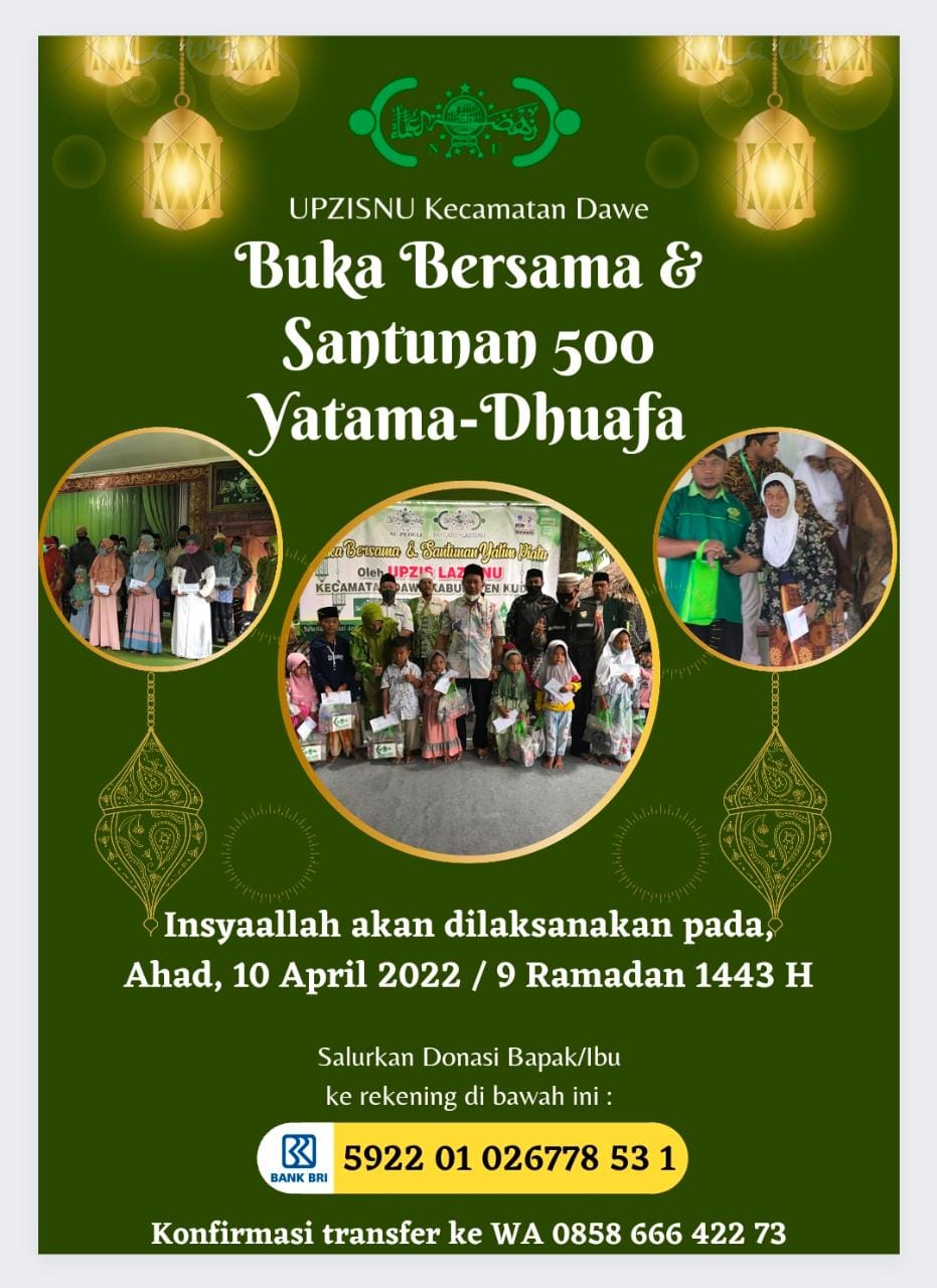 KUDUS, Suaranahdliyin.com – Unit pengelola zakat infaq sedekah Nahdlatul Ulama (UPZISNU) Kecamatan Dawe kembali mengagendakan acara santunan dan buka bersama. Kali ini, mereka mentarget akan ada 500 peserta dari kalangan anak yatim dan dhuafa.