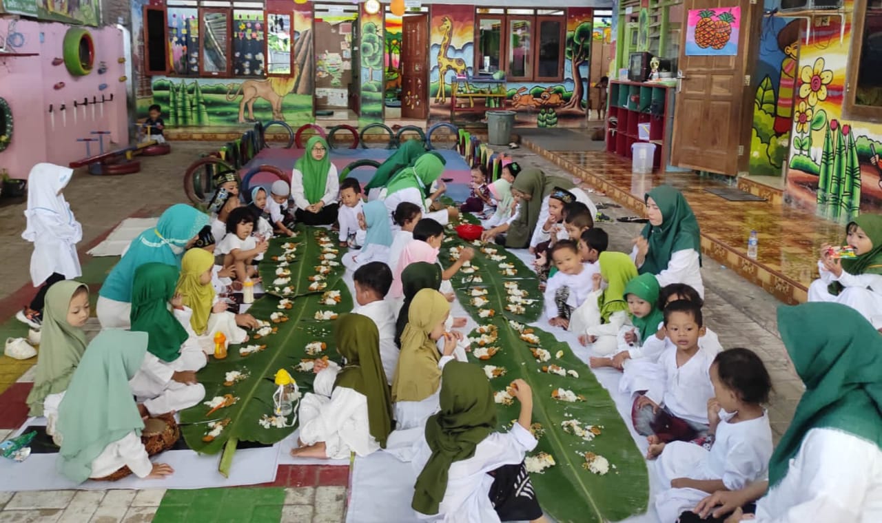 KUDUS, Suaranahdliyin.com – Tak kurang dari 240 peserta didik pada KB Al-Azhar Jekulo, Kudus, duduk bersila dan saling berhadapan satu sama lain, belum lama ini. Di hadapan mereka, nampak menu sederhana beralaskan daun pisang, untuk dimakan bersama.