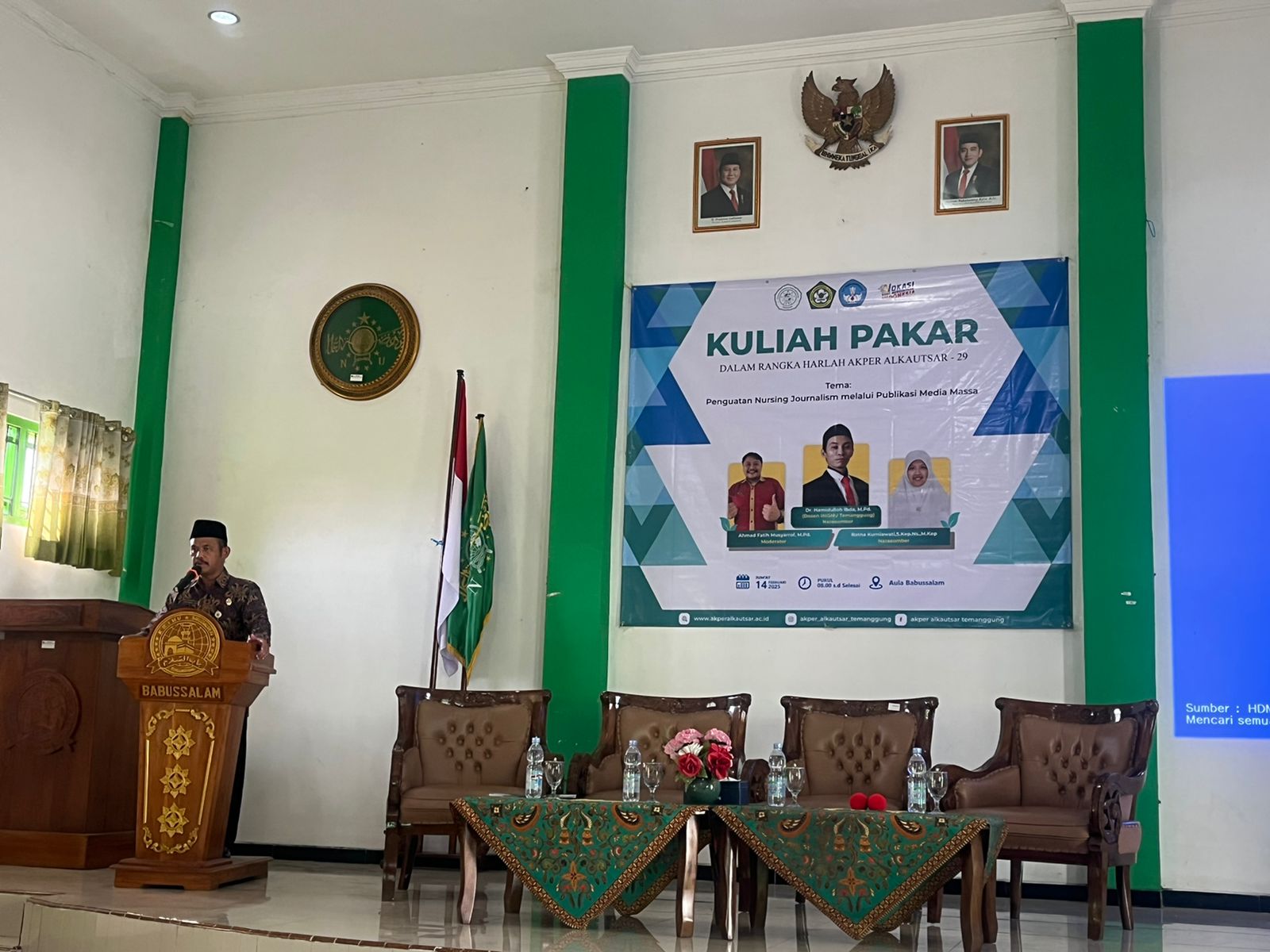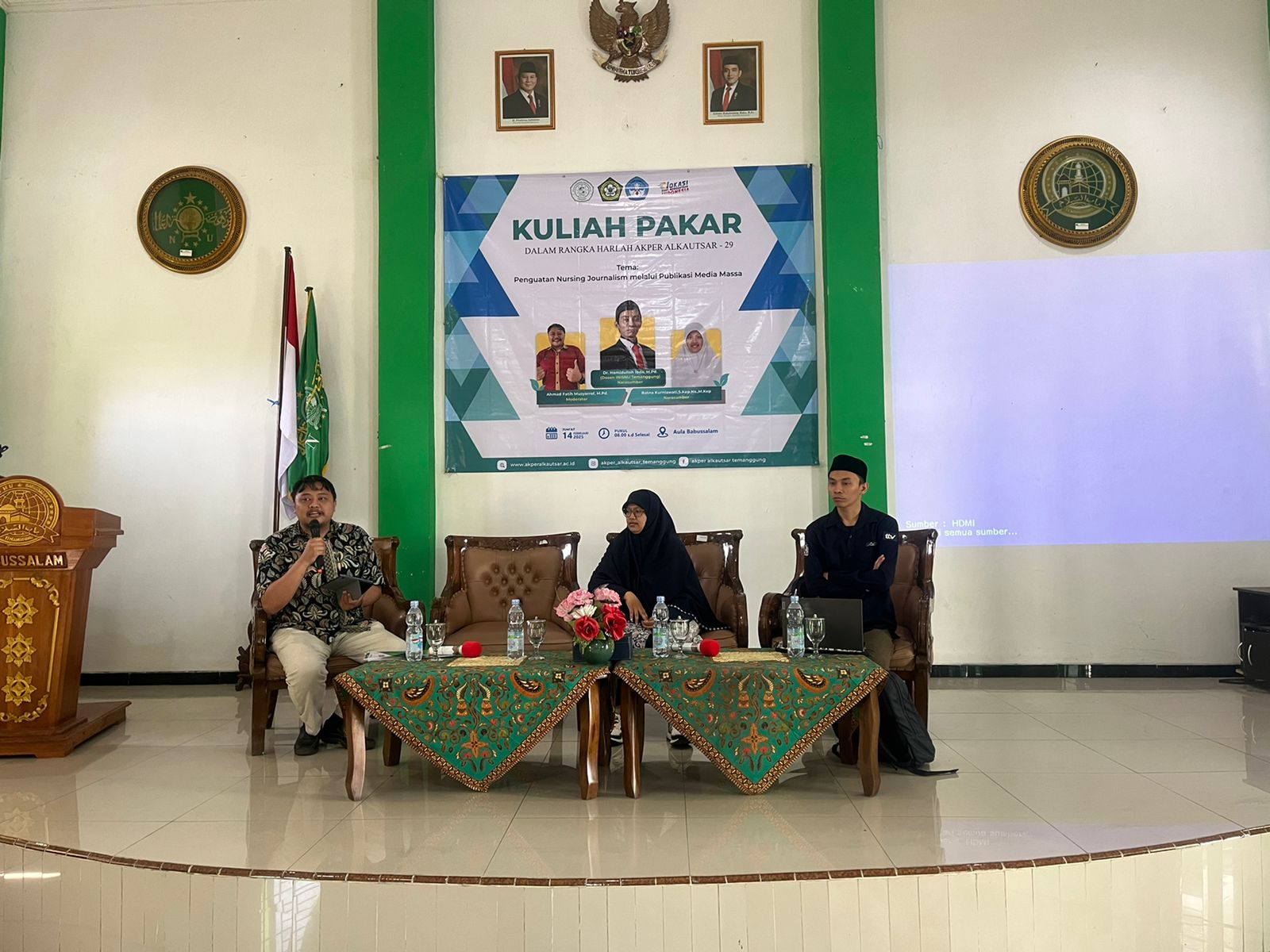 TEMANGGUNG,Suaranahdliyin.com – Sebanyak 111 mahasiswa-mahasiswi Akademi Keperawatan (AKPER) Alkautsar Temanggung mengikuti Kuliah Pakar Nursing Journalism Jum’at (14/2/2025). Dalam kesempatan itu, mereka mendapat bekal pelatihan jurnalisme keperawatan dengan narasumber dosen AKPER Alkautsar Ratna Kurniawati, S.Kep., Ns., M.Kep, dan dosen Inisnu Temanggung Dr. Hamidulloh Ibda.