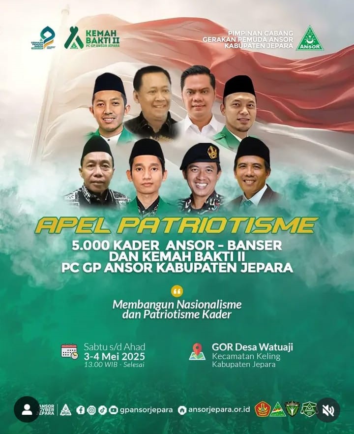 JEPARA, Suaranahdliyin.com – GP Ansor Kabupaten Jepara akan menyelenggarakan Apel Patriotisme dirangkai dengan Kemah Bakti II pada Sabtu – Ahad (3-4 Mei 2025) mendatang.