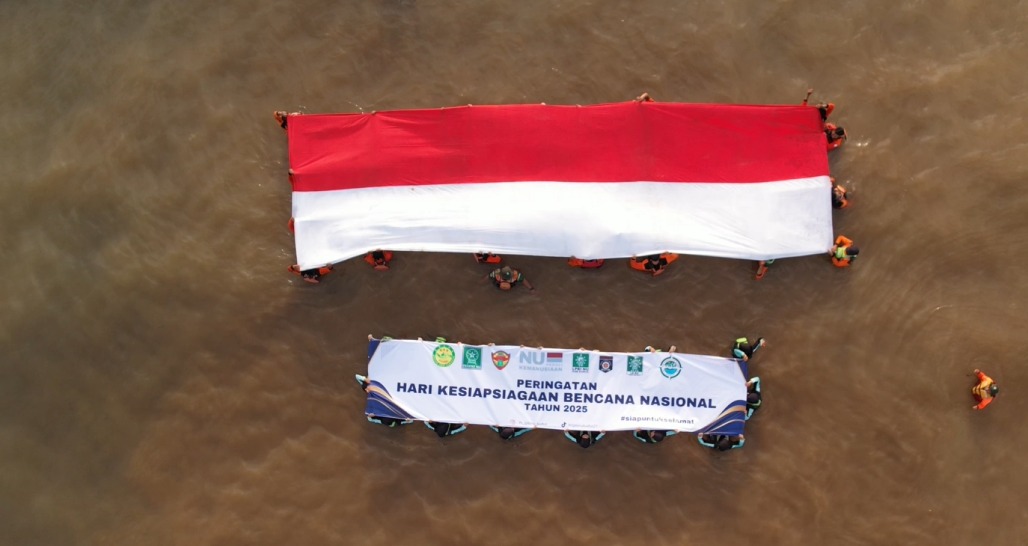 JEPARA, Suaranahdliyin.com – Puluhan relawan NU Peduli Kudus mengikuti apel Hari Kesiapsiagaan Bencana Nasional (HKBN) 2025 di tengah lautan pantai Sembu desa Mulyoharjo Jepara Ahad (20/4/2025). Dalam kegiatan yang diinisiasi Lembaga Penanggulangan Bencana dan Perubahan Iklim Nahdlatul Ulama (LPBI NU) Kudus ini, mereka membentangkan merah putih ukuran besar dan mendoakan untuk keselamatan Indonesia dari bencana.