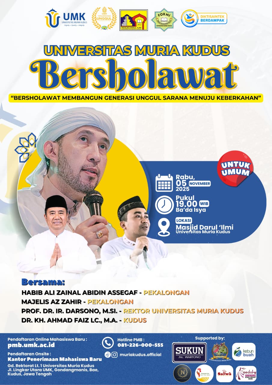 KUDUS, Suaranahdliyin.com – Bertempat di halaman masjid Darul Ilmi Kampus Universitas Muria Kudus (UMK), akan diselenggarakan UMK Bersholawat, Rabu (5/11/2025) malam mulai bakda Isyak.