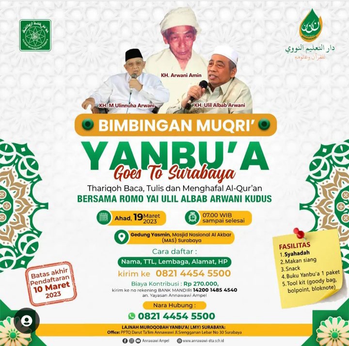 SURABAYA, Suaranahdliyin.com – Lembaga Muraqabah Yanbu’a (LMY) Surabaya akan menyelenggarakan bimbingan Muqri’ Yanbu’a pada Ahad (19/3/2023) mendatang.