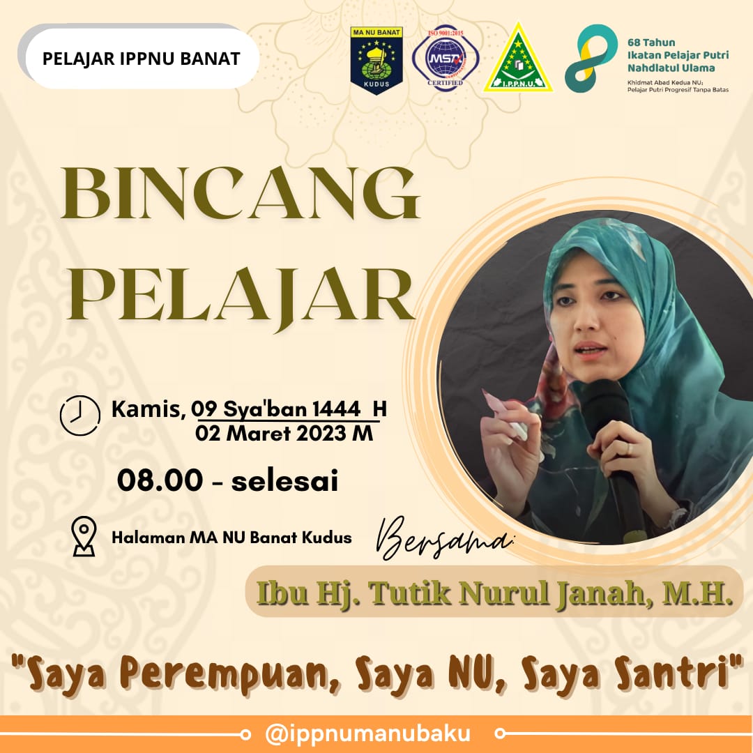 KUDUS,Suaranahdliyin.com – Pimpinan Komisariat Ikatan Putri Nahdlatul Ulama (PK IPPNU) Madrasah Aliyah NU Banat Kudus akan mengadakan acara bertajuk Bincang Pelajar pada Kamis (2/3/2023). Kegiatan untuk memeringati hari lahir ke-68 IPPNU itu menghadirkan pembicara Hj.Tutik Nurul Janah (dosen Institut Mathali’ul Falah/IPMAFA Kajen).