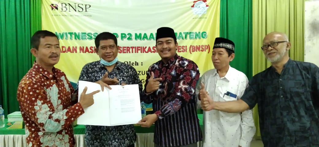 Pada kesempatan itu, M Zubair (BNSP) menyerahkan Surat Keputusan (SK) pendirian LSP P2 Maarif Jateng, setelah melakukan witness menganjurkan LSP Maarif Jateng menjalin kerja sama dengan berbagai pihak, terutama perusahaan-perusahaan nasional di setiap kota. “Kami berharap, lulusan sekolah Maarif dapat terserap dengan baik,” ujarnya.