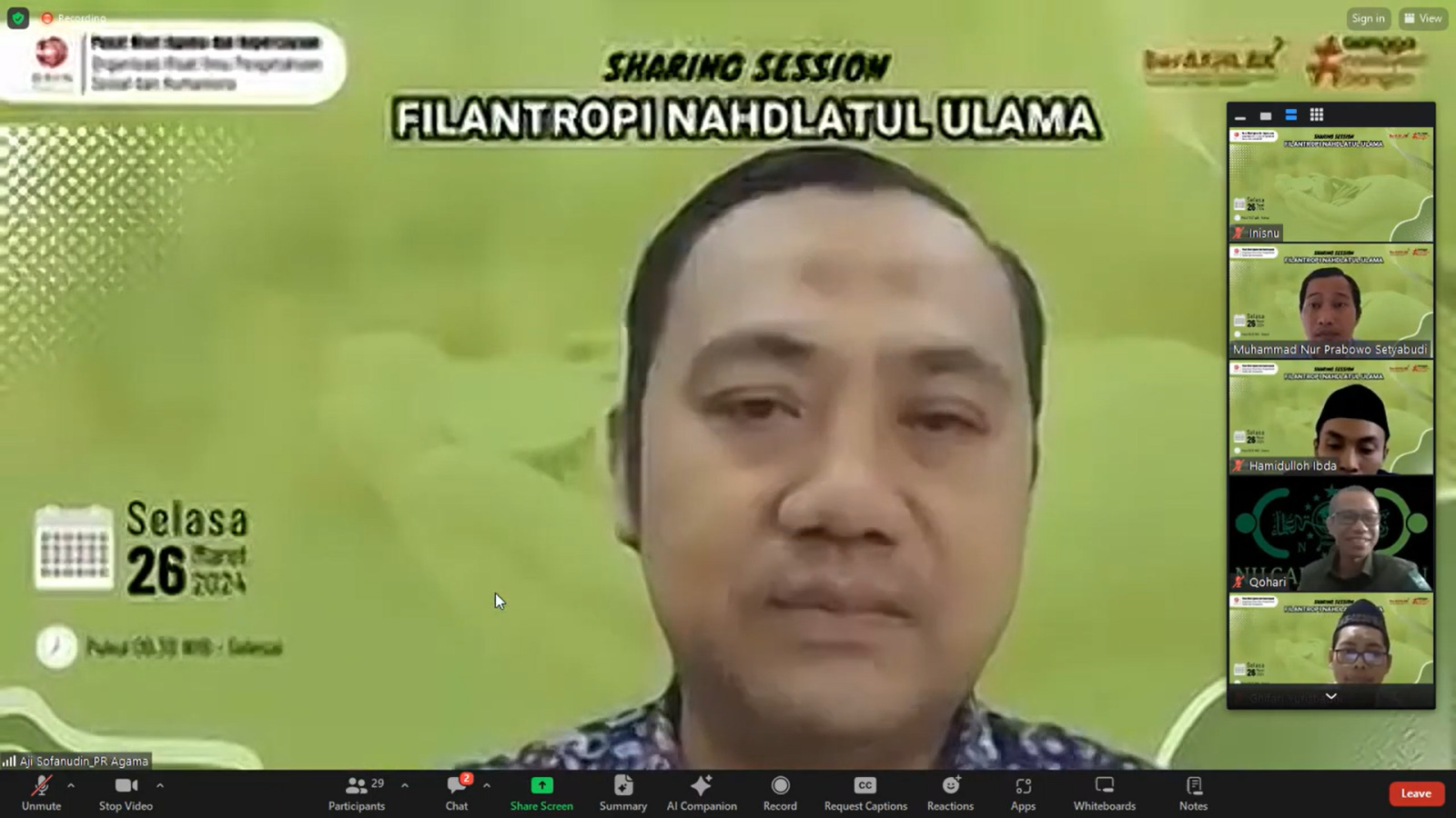 JAKARTA, Suaranahdliyin.com – Pusat Riset Agama dan Kepercayaan (PRAK) Organisasi Riset Ilmu Pengetahuan Sosial dan Humaniora (IPSH) Badan Riset dan Inovasi Nasional (BRIN) menyelenggarakan Focus Discussion Group (FGD) atau Sharing Session melalui platform Zoom Meeting bertajuk “Filantropi Nahdlatul Ulama”.Selasa (26/3/2024)