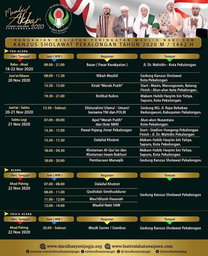“Maulid Akbar In sya Allah digelar pada hari Ahad Pahing, 22 November 2020, untuk acara Jumat Kliwon yang semula tanggal 20 November 2020 diundur, dialihkan pada Jumat depannya, yakni tanggal 27 November 2020,” tutur Habib Luthfi menginformasikan kepada segenap jamaah yang hadir.