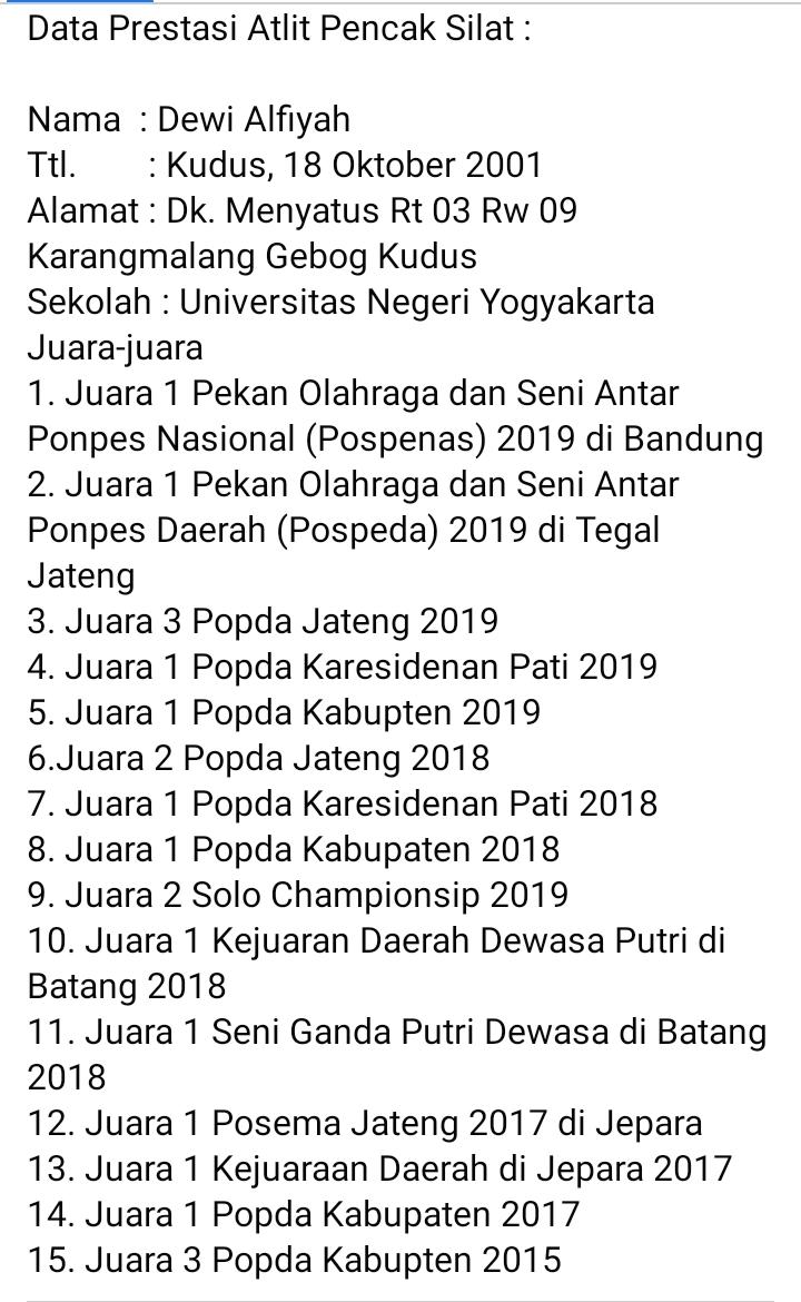 “Itu menjadi prestasi pencak silat saya yang paling bergengsi di tingkat remaja,”ujar mahasiswi semester 1 jurusan Pendidikan Jasmani Kesehatan dan Rekreasi Universitas Negeri Yogyakarta (UNY).