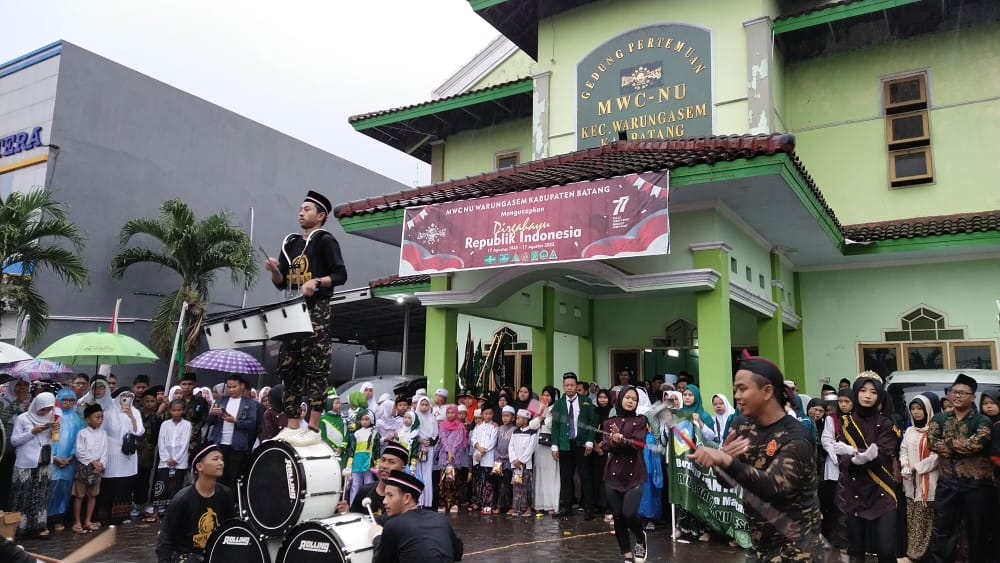 Terlihat dari para peserta dari berbagai Badan Otonom (Banom) NU, Sekolah Lembaga Pendikan Ma’arif, Madrasah dan Santri se-kecamatan warungasem tetap semangat melantukan Sholawat dan Mars Shubanul Wathon disepanjang jalan mesti diguyur hujan lebat.