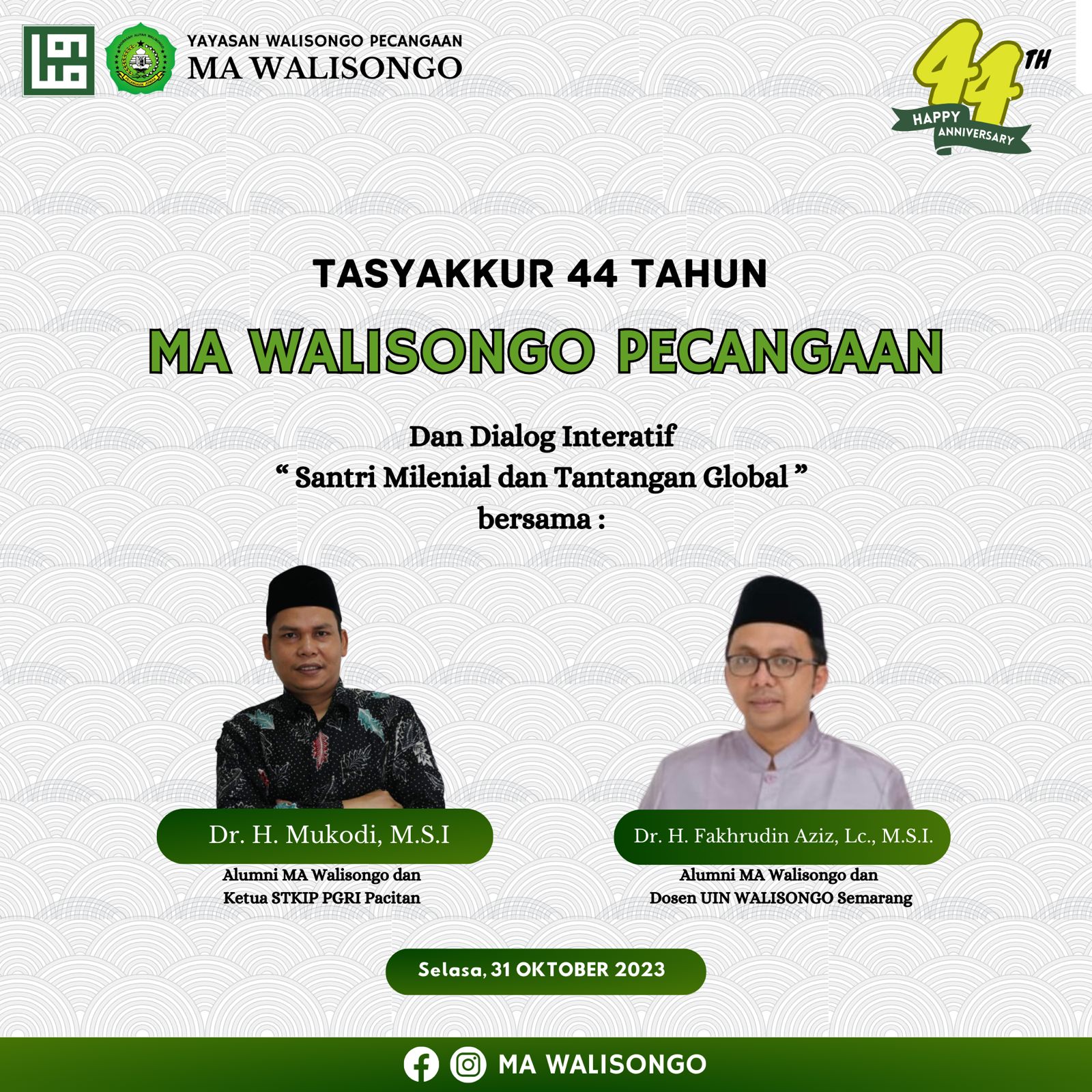 Kegiatan digelar pada Selasa (31/10/2023), dengan menghadirkan dua alumni, yakni H Mukodi (Ketua STKIP PGRI Pacitan, Jawa Timur) dan Fakhrudin Aziz (dosen UIN Walisongo, Semarang).