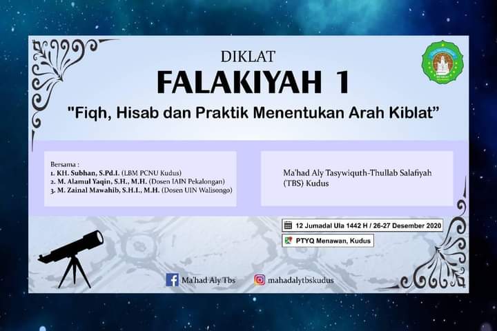 KUDUS, Suaranahdliyin.com – Ma’had Aly Tasywiquth Thullab Salafiyah (TBS) Kudus akan menyelenggarakan Diklat Falakiyah I bagi para mahasantri, Ahad (27/12/2020) besok.