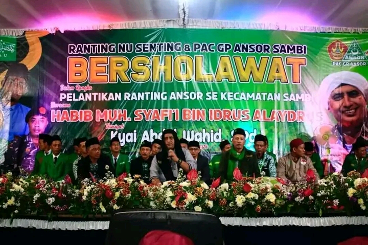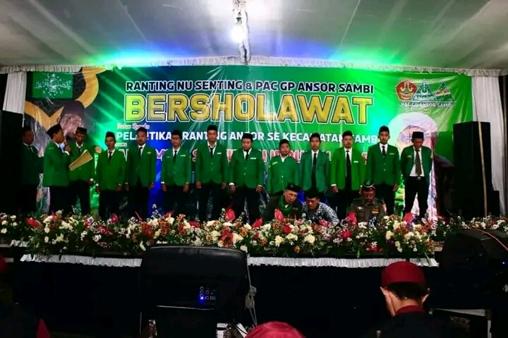Kendati sempat diguyur hujan, pelantikan yang digelar dalam rangkaian “NU Senting dan Pimpinan Anak Cabang GP Ansor Kecamatan Sambil Bersholawat”, ini berjalan khidmat dan lancar.