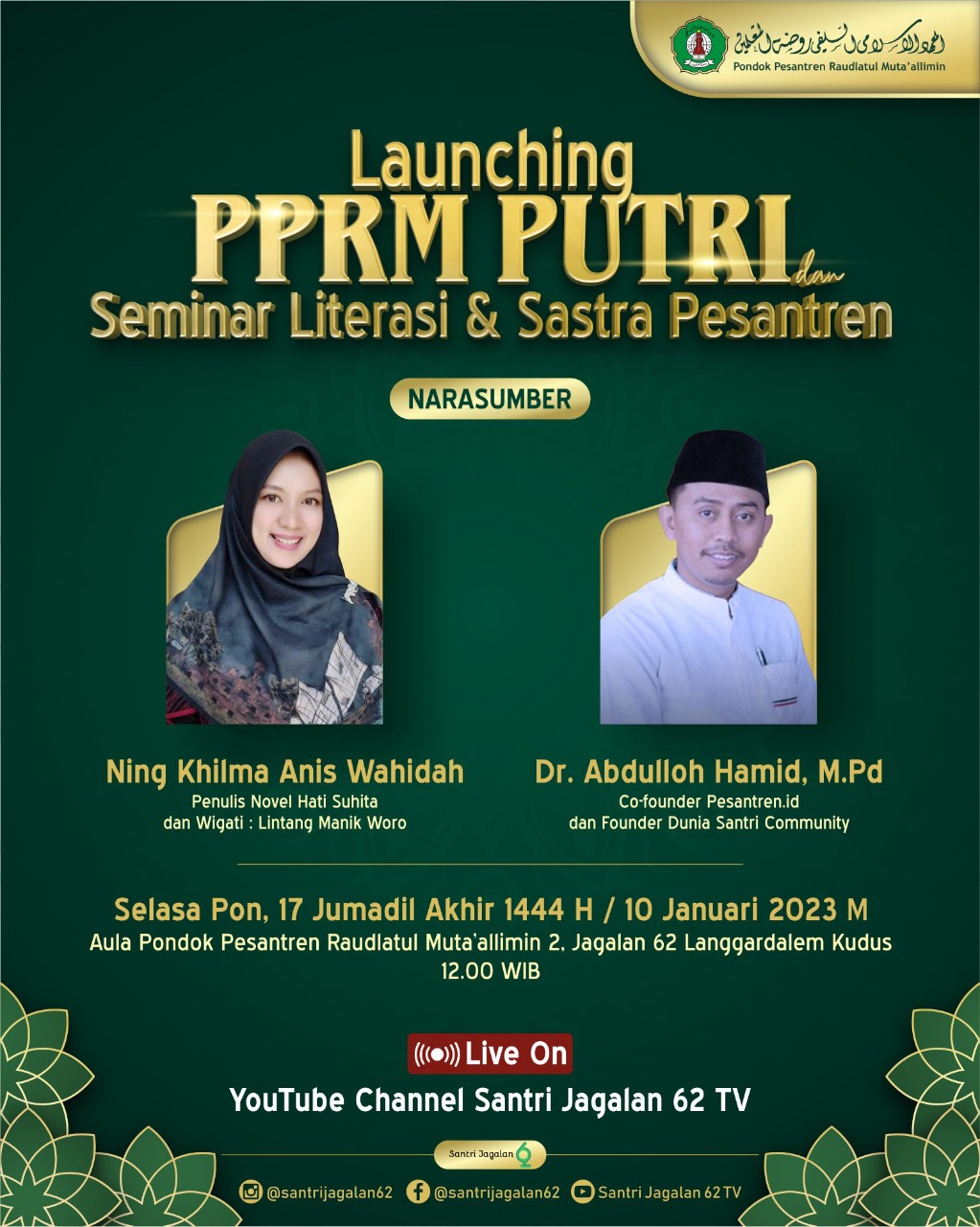 Dalam launching dan peresmian PPRM Putri ini akan dirangkai kegiatan Seminar Literasi dan Sastra Pesantren bersama Ning Khilma Anis Wahidah (novelis “Suhita” dan sastrawan) dan Dr.Abdulloh Hamid (Founder Dunia Santri Community). Dalam acara yang akan disiarkan live on youtube ini, PPRM akan menghadirkan 300 undangan mulai pukul 13.30 – 16.00 WIB..