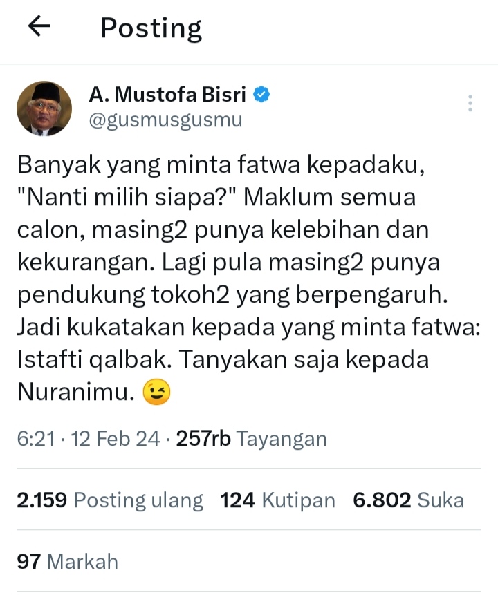Penegasan itu disampaikan Gus Mus melalui media sosial X (twitter) pada akun pribadinya @gusmugusmu, Senin (12/2/2024).