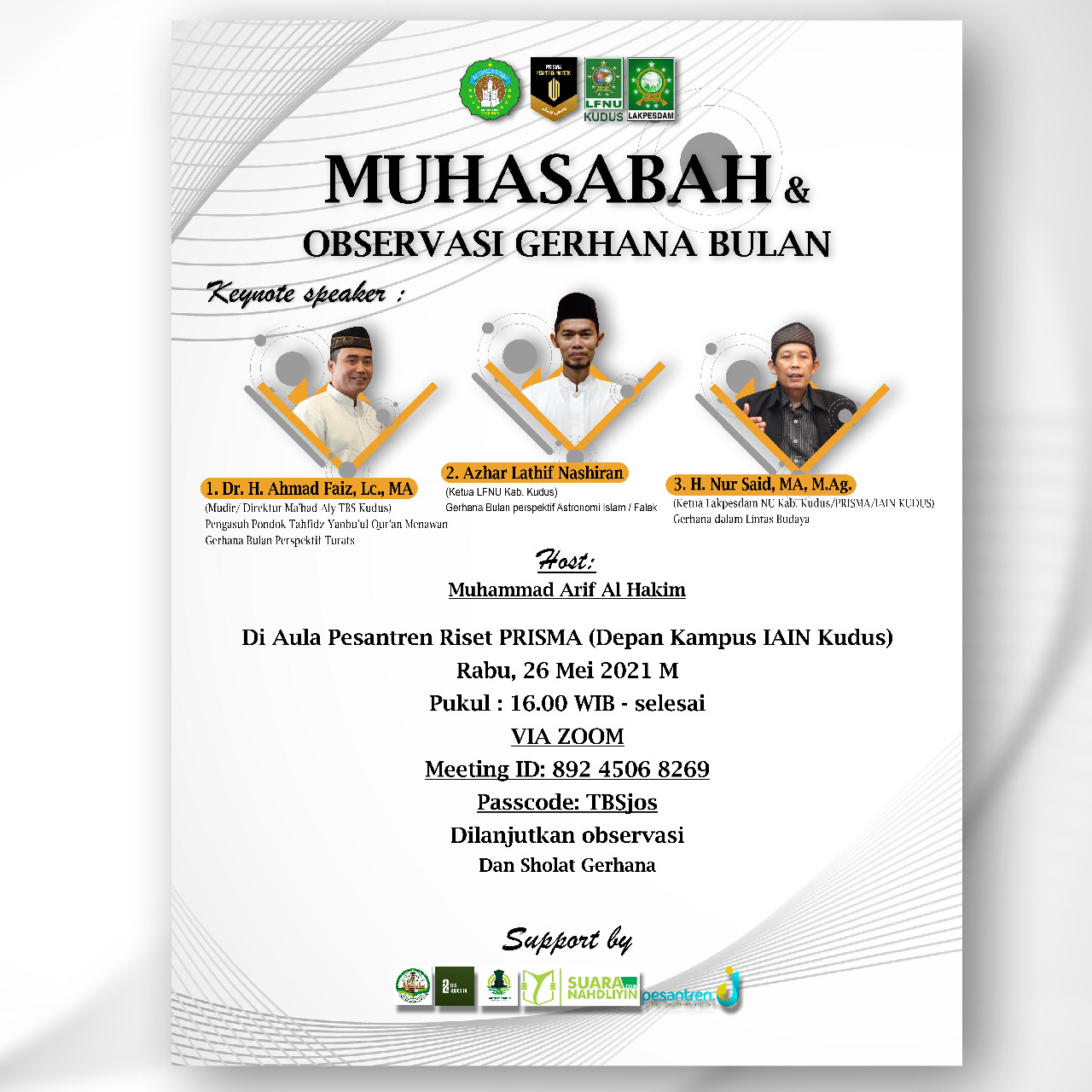 Muhasabah dan observasi gerhana bulan ini, akan dilangsungkan di Pesantren Riset Sains – Spiritual Moderasi Al-Quran (PRISMA) dan disiarkan melalui zoom meeting, Rabu (26/5/2021) mulai pukul 16.00 WIB.