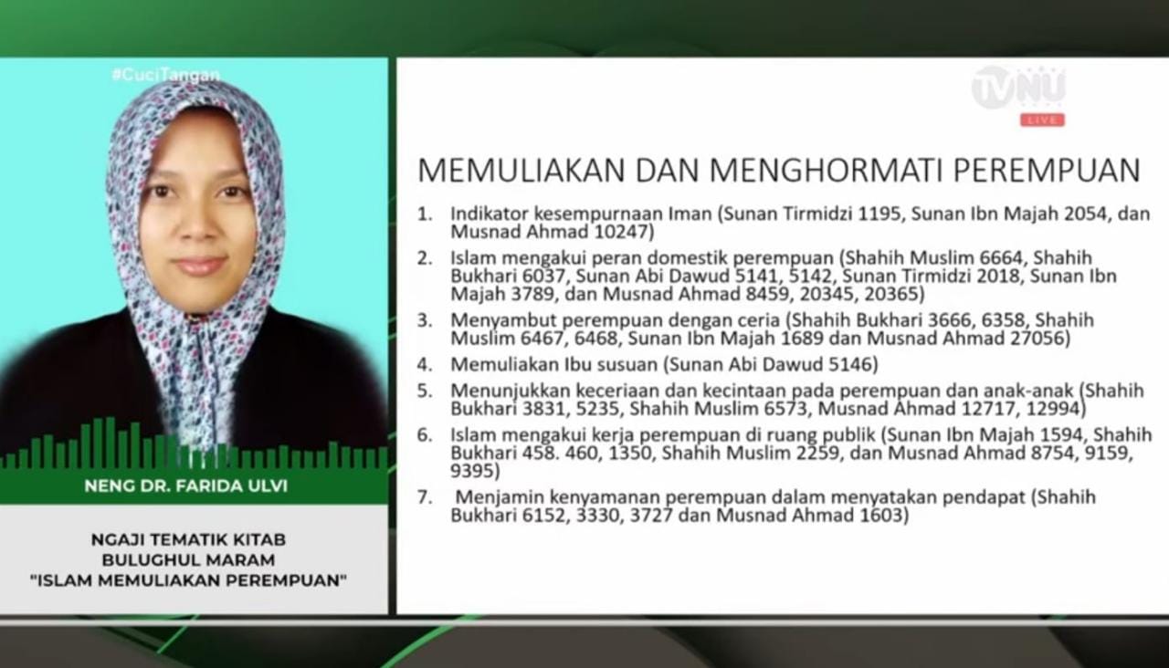 Dia juga menunjukkan beberapa hadis yang menganjurkan untuk memuliakan dan menghormati perempuan. “Islam mengakui peran domestik perempuan, ini tentang hadis siapa yang harus saya rawat, jawab nabi ibumu, ibumu, ibumu dan seterusnya,” terangnya.