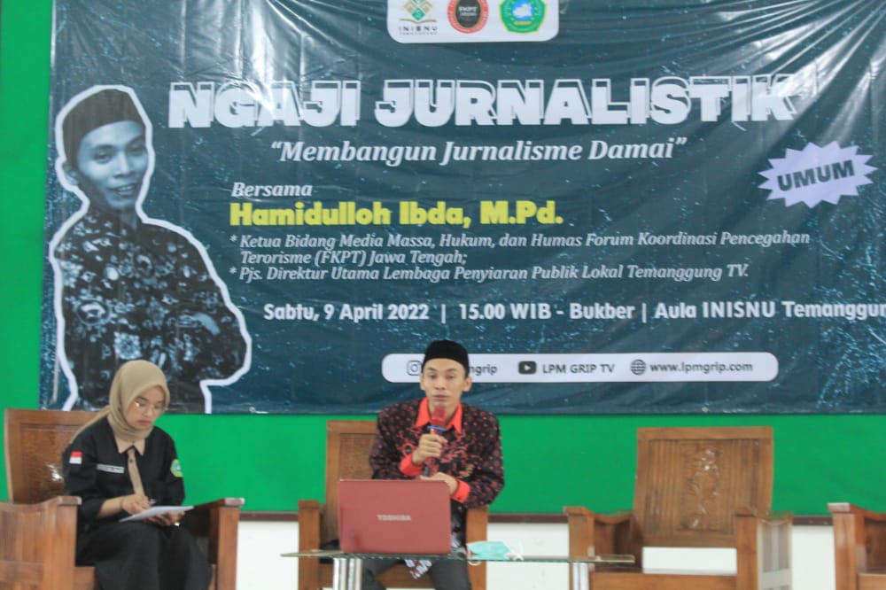 TEMANGGUNG,Suaranahdliyin.com – Lembaga Pers Mahasiswa (LPM) Grip INISNU Temanggung bekerjasama dengan Forum Koordinasi Pencegahan Terorisme (FKPT) Jawa Tengah menggelar Ngaji Jurnalistik bertajuk Membangun Jurnalisme Damai Sabtu (9/4/2022 Kegiatan yang bertempat di aula INISNU itu dihadiri lebih dari 116 peserta dari unsur mahasiswa dan umum di wilayah eks Karesidenan Kedu.