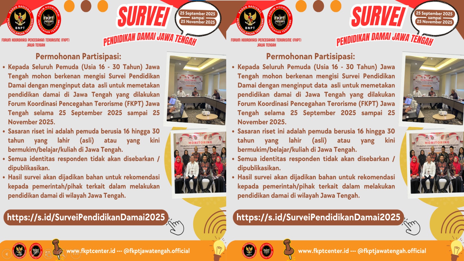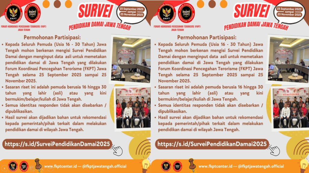 SEMARANG,Suaranahdliyin.com – Forum Koordinasi Pencegahan Terorisme (FKPT) Jawa Tengah menyelenggarakan Survei Pendidikan Damai Jawa Tengah yang berlangsung mulai 25 September 2025 hingga 25 November 2025. Survei ini ditujukan kepada para pemuda berusia 16 hingga 30 tahun, baik yang lahir di Jawa Tengah maupun yang saat ini tinggal, belajar, atau kuliah di wilayah Jawa Tengah.