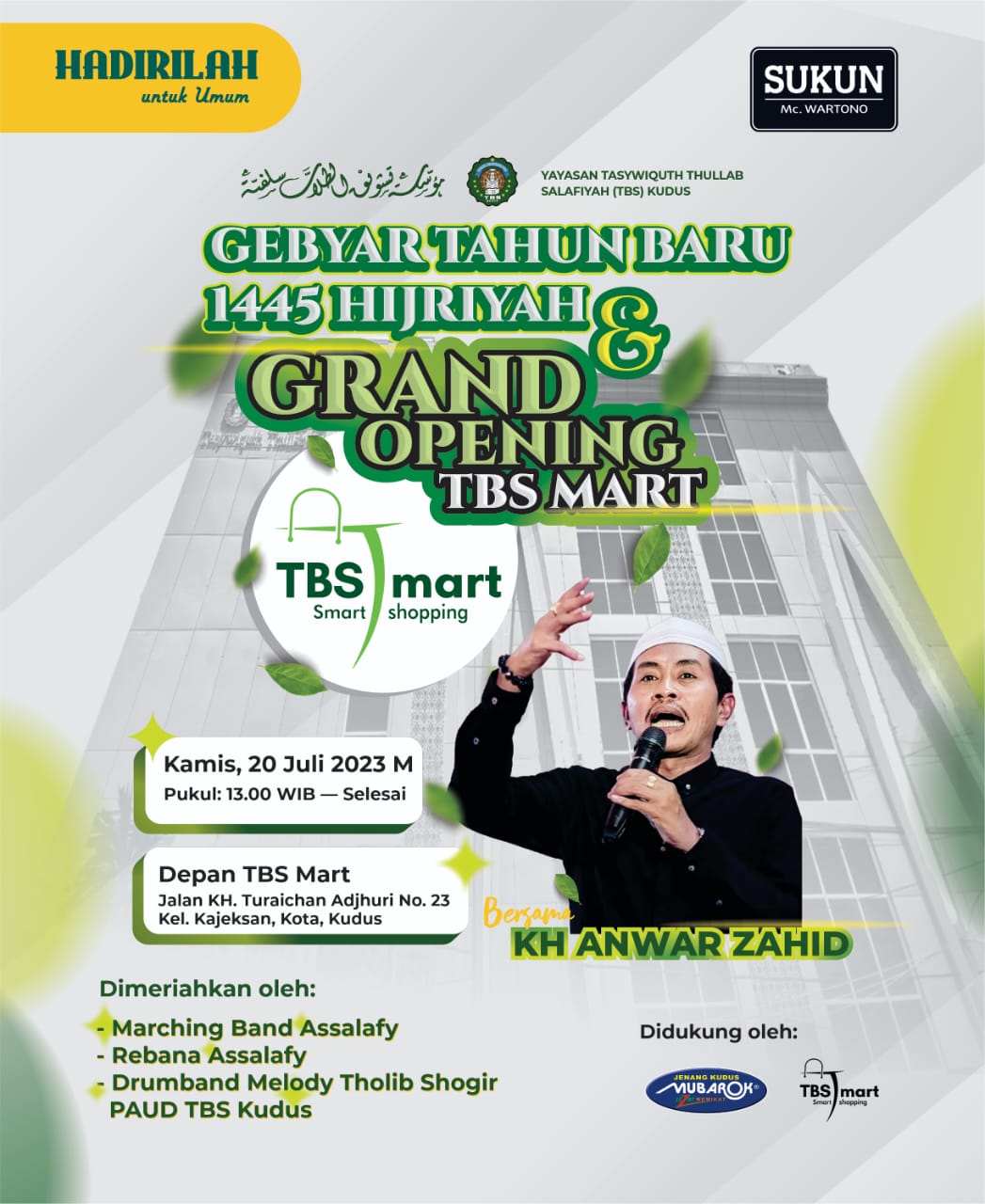 KUDUS, Suaranahdliyin.com – Yayasan Tasywiquth Thullab Salafiyah (TBS) Kudus, akan menggelar Gebyar Tahun Baru 1445 Hijriyah, yang sekaligus dalam rangka Grand Opening TBS Mart. Acara tersebut akan digelar di depan TBS Mart pada Kamis (20/7/2023) mendatang mulai pukul 13.00 WIB.
