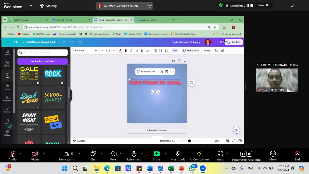 JEPANG, Suaranahdliyin.com – Pengurus Divisi Bidang Media dan Informasi Pengurus Cabang Istimewa (PCI) Fatayat Nahdlatul Ulama (NU) Jepang menyelenggarakan Pelatihan Desain Poster berbasis Canva. Dengan Dipandu Alviaturrohmah, pelatihan bertema “Berkreasi Tanpa Batas Meningkatkan Kreativitas” berlangsung melalui Zoom pada Sabtu (7/7).