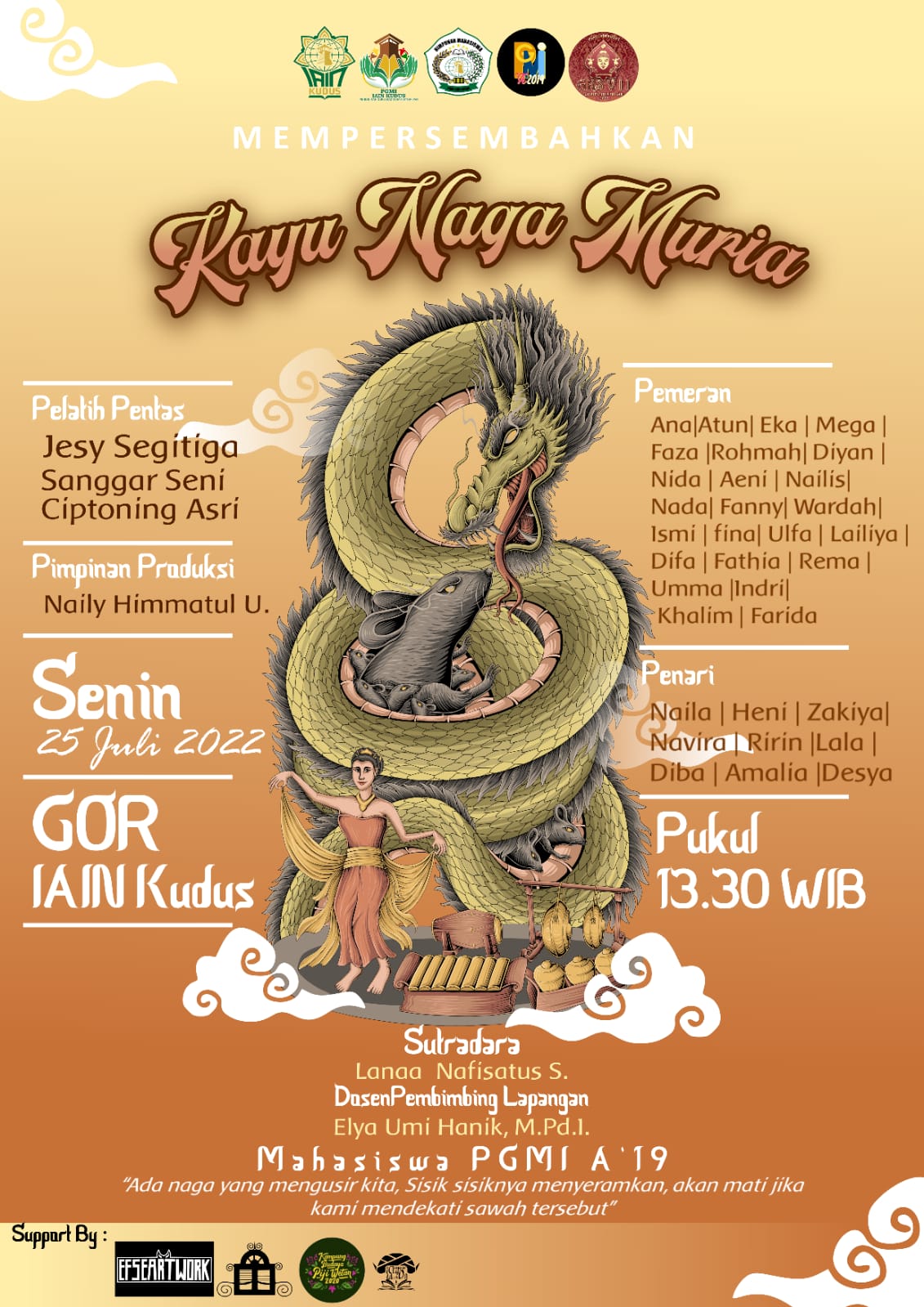 KUDUS,Suaranahdliyin.com – Dalam rangka memeriahkan Gebyar Kreatifitas Mahasisw (GKS) VII, Mahasiswa Pendidikan Guru Madrasah Ibtidaiyah (PGMI) angkatan 19 IAIN Kudus bakal menampilkan pentas pertunjukan bertajuk “Kayu Naga Muria” di GOR IAIN Kudus Senin, (25/7/2022) siang ini.