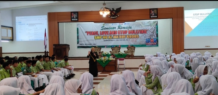 KUDUS, Suaranahdliyin.com – Sekolah Menengah Pertama Nahdlatul Ulama ( SMPNU) Al-Ma’ruf Kudus menyelenggarakan Seminar Remaja Peace, Love and Stop Bullying di Gedung DPRD Kudus, Sabtu (9/3/2024). Kegiatan diikuti seluruh peserta didik SMPNU Al-Ma,ruf itu menghadirkan pembicara dosen IAIN Kudus Farida, M.SI.