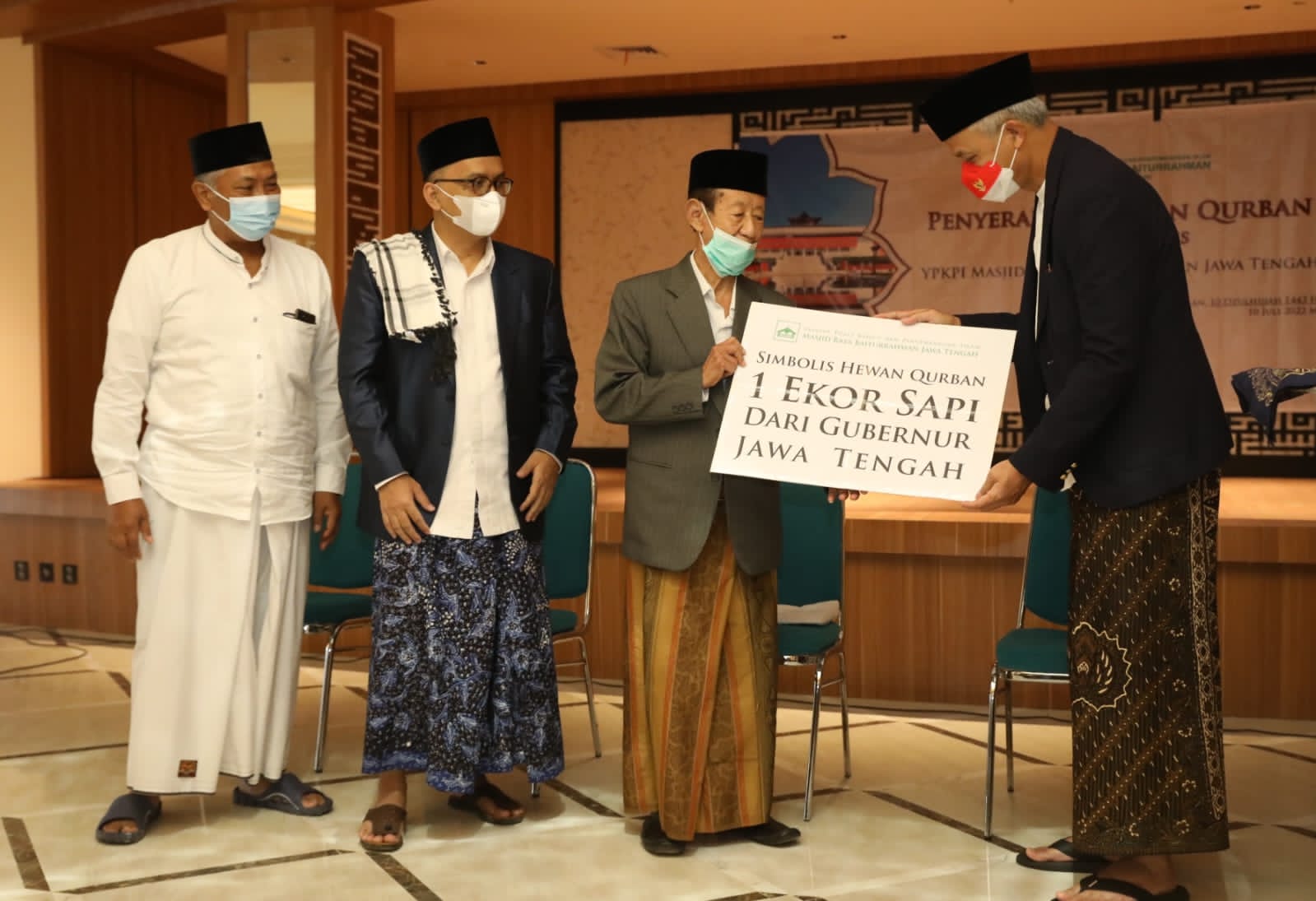 Usai melaksanakan salat id, Ganjar berserta keluarga menyerahkan hewan kurban secara simbolis, kepada panitia penyembelihan hewan kurban Masjid Raya Baiturrahman Semarang. Hewan kurban berupa seekor sapi diserahkan kepada Ketua Umum Yayasan Pusat Kajian dan Pengembangan Islam (YPKPI) Masjid Raya Baiturrahman, Dr KH Ahmad Daroji.