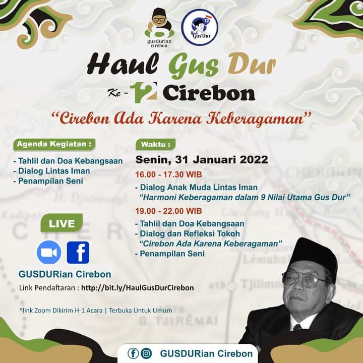 Acara tersebut akan dilaksanakan pada Senin (31/1/2022) mendatang mulai pukul 16.00 hingga 22.00 WIB melalui zoom meeting. Bagi yang ingin bergabung, silakan registrasi melalui link pendaftaran: bit.ly/HaulGusDurCirebon.