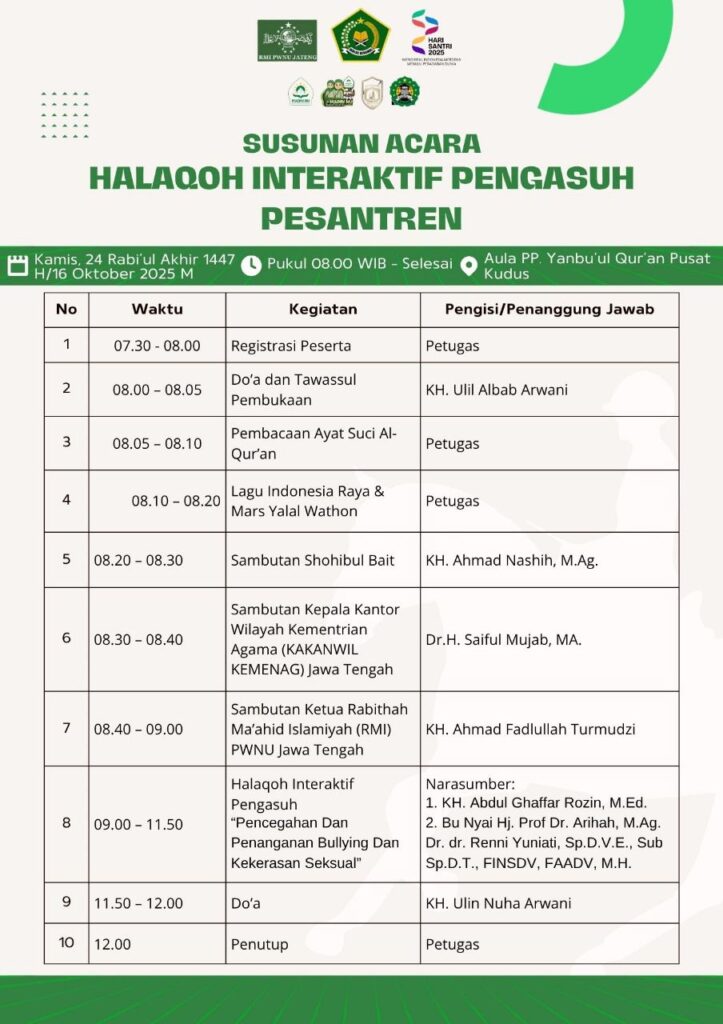 KUDUS, Suaranahdliyin.com – Bertempat di Aula Pondok Tahfidh Yanbu’ul Qur’an Kudus, akan diselenggarakan halaqah interaktif pengasuh pesantren, Kamis (24/10/2025) besok.