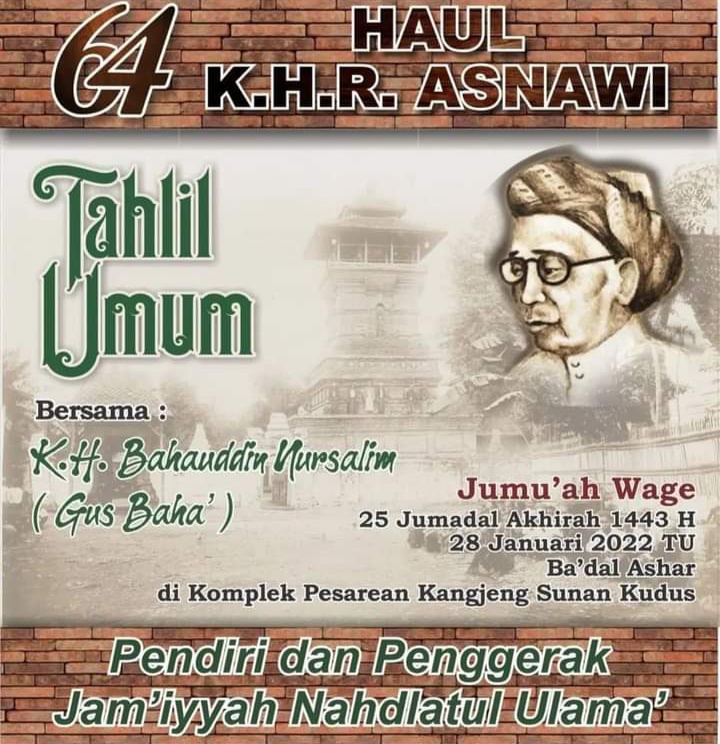 Tahlil umum yang akan digelar bakdal Ashar, itu rangka memeringati haul ke – 64 KH R Asnawi, salah satu tokoh kharismatik asal Kabupaten Kudus yang juga tokoh pendiri Nahdlatul Ulama (NU).