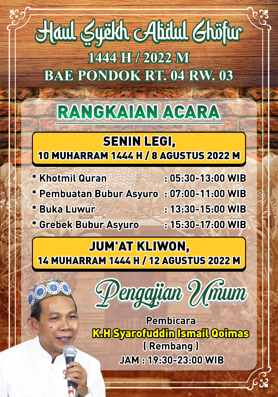 KUDUS, Suaranahdliyin.com – Warga Bae Pondok, Kecamatan Bae, Kabupaten Kudus, khususnya warga RT 04 RW III, akan menggelar haul Syaikh Abdul Ghofur 1444 H / 2022 M.