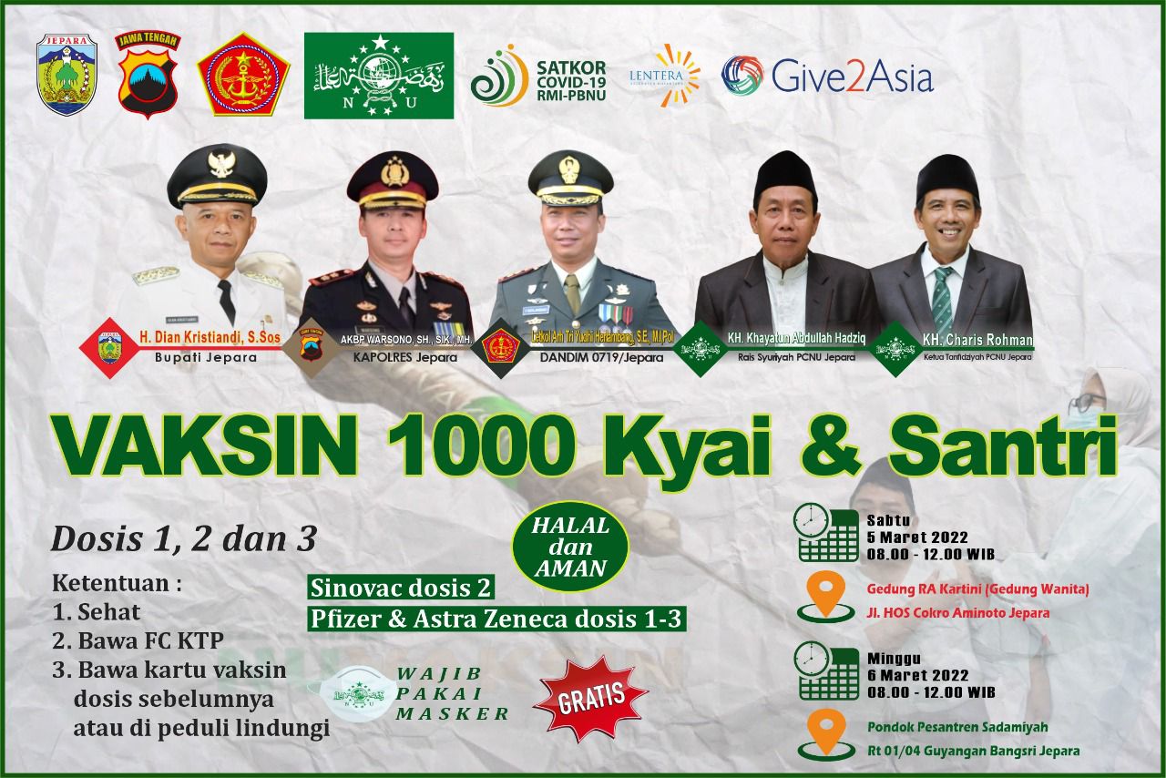 Ini sebagai ikhtiar pengurus Nahdlatul Ulama (NU) dalam menjaga para kiai, nyai dan santri agar selalu sehat, bangkit dan mampu beradaptasi dengan keadaan sekarang. Vaksinasi dilangsungkan selama dua hari, yakni Sabtu (5/3/22) di Gedung RA Kartini Kota Jepara dan Ahad (6/3/22) di Pesantren Sadamiyah Guyangan, Bangsri, Jepara.