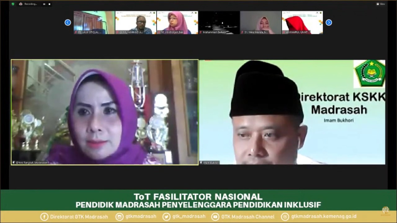 Kegiatan ToT Fasnas Madrasah Penyelenggara Pendidikan Inklusif berbasis Gender, Disabilitas dan Inklusi Sosial (GEDSI) oleh Direktorat Jenderal Pendidikan Islam itu, bekerja sama dengan INOVASI dan Froum Pendidik Madrasah Inklusif (FPMI) ini digelar melalui Zoom Meeting dan juga disiarkan langsung melalui channel Youtube GTK Madrasah Channel.