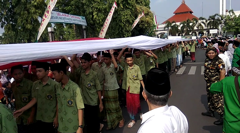 Yel-yel dikumandangkan oleh para kontingen dalam kesempatan itu. Lagu Ya Lal Wathan juga menggema, diiringi dengan alat musik tradisional, Terbang Papat, hingga drum band oleh peserta parade.