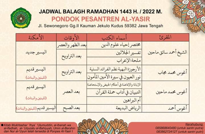 KUDUS, Suaranahdliyin.com – Sebagaimana biasanya saat Ramadan, Pondok Pesantren (Ponpes) Al-Yasir dan pondok – pondok lain di Jekulo dan di tanah air secara umum, selalu menyelenggarakan kajian Ramadan.