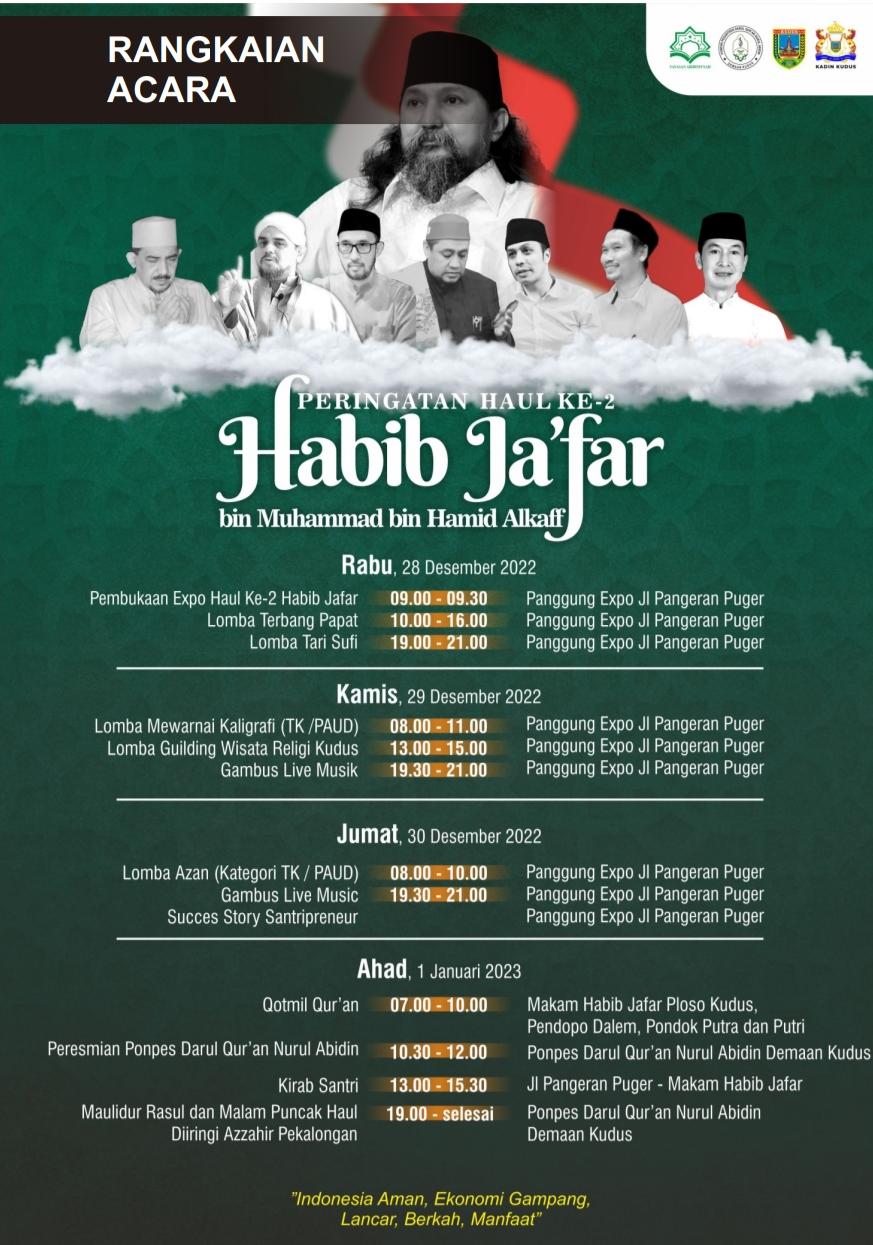 KUDUS, Suaranahdliyin.com – Dalam waktu dekat, akan digelar rangkaian peringatan haul ke-2 Habib Ja’far Al-Kaff. Beragam kegiatan telah disiapkan untuk menyemarakkannya.