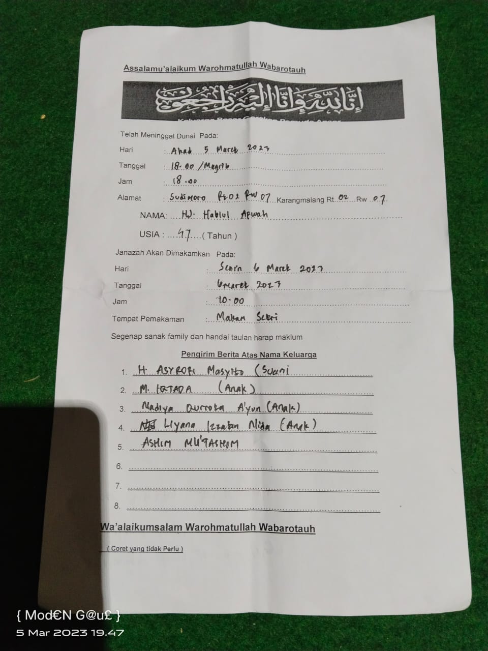 “Jenazah almarhumah akan dimakamkan Senin (6/3/2023) pukul 10.00 Wib di pemakaman Setri Sudimoro, “demikian yang tertulis dalam kabar duka.