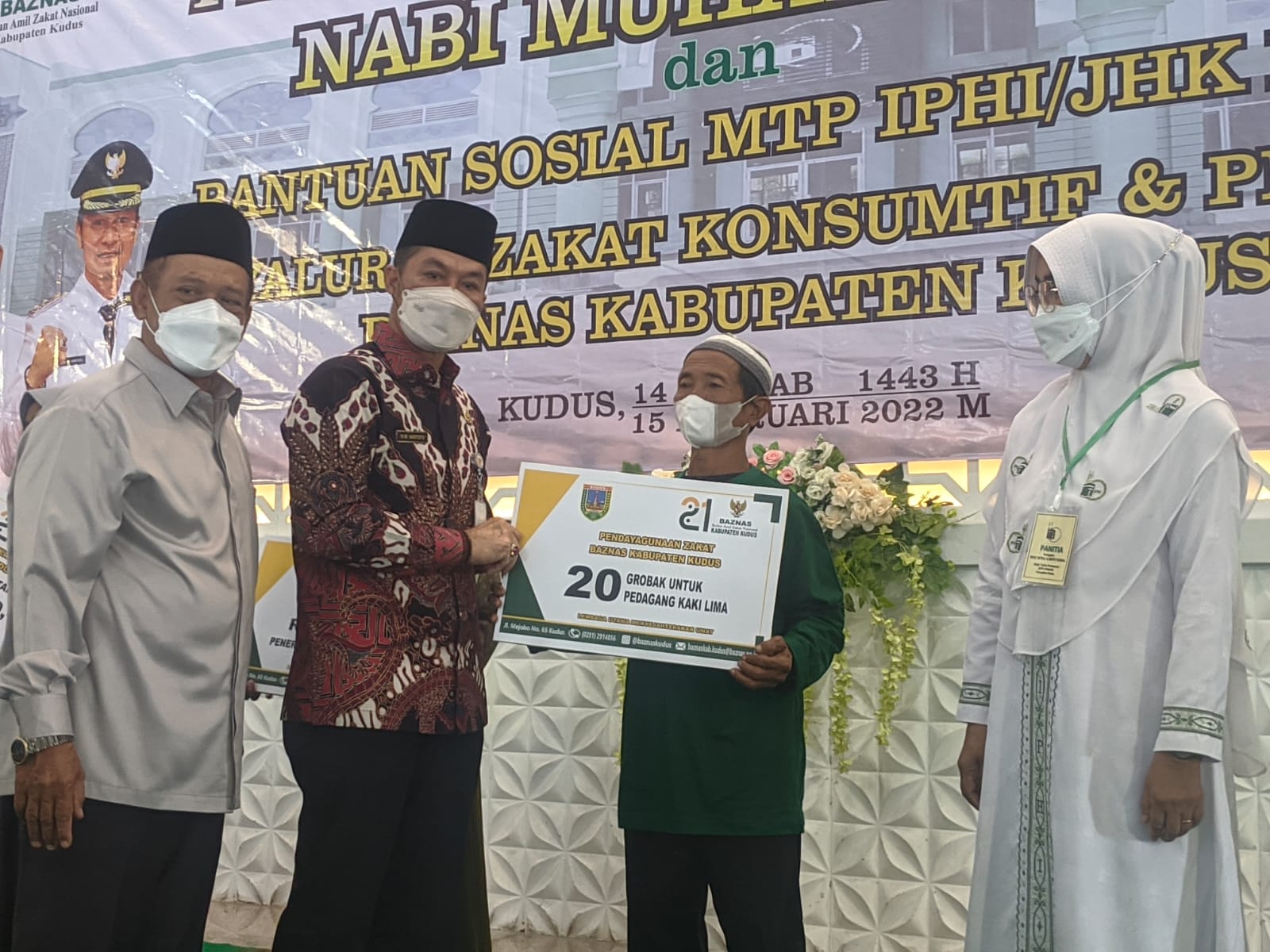 Penyerahan bantuan bersama Badan Amil Zakat (BAZNAS) Kudus ini diserahkan secara langsung bersamaan dengan peringatan Isra’ Mi’raj Nabi Muhammad Saw di Gedung JHK Kudus, Selasa (15/02/2022).