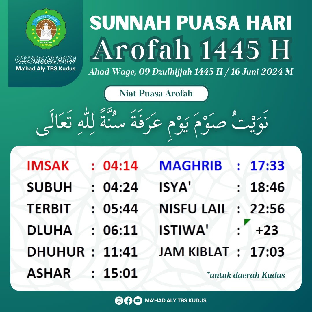 Agenda Jadwal Imsakiyah Puasa Arafah untuk Wilayah Kudus, 9 Zulhijjah 1445 H 15 June 2024 0 1629 Share on Facebook Tweet on Twitter Comments Share this:Click to share on WhatsApp (Opens in new window)Click to share on Facebook (Opens in new window)Click to share on Twitter (Opens in new window)Click to share on Telegram (Opens in new window) Related