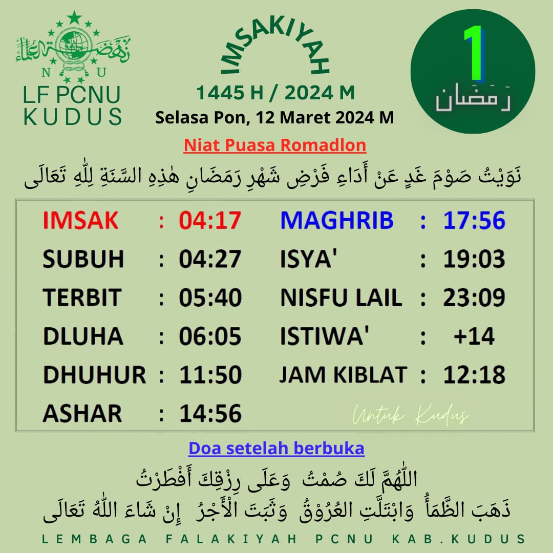 Ramadan Jadwal Imsakiyah untuk Kudus dan sekitarnya, 1 Ramadan 1445 H 11 March 2024 0 1370 Share on Facebook Tweet on Twitter Comments Share this:Click to share on WhatsApp (Opens in new window)Click to share on Facebook (Opens in new window)Click to share on Twitter (Opens in new window)Click to share on Telegram (Opens in new window) Related