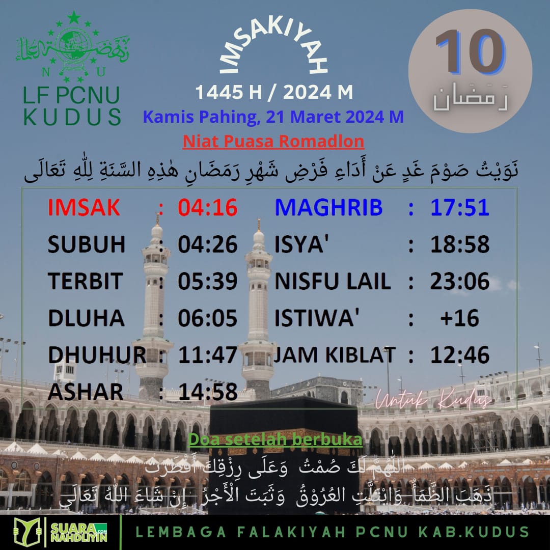 Ramadan Jadwal Imsakiyah untuk Kudus dan Sekitarnya, 10 Ramadan 1445 H 20 March 2024 0 762 Share on Facebook Tweet on Twitter Comments Share this:Click to share on WhatsApp (Opens in new window)Click to share on Facebook (Opens in new window)Click to share on Twitter (Opens in new window)Click to share on Telegram (Opens in new window) Related