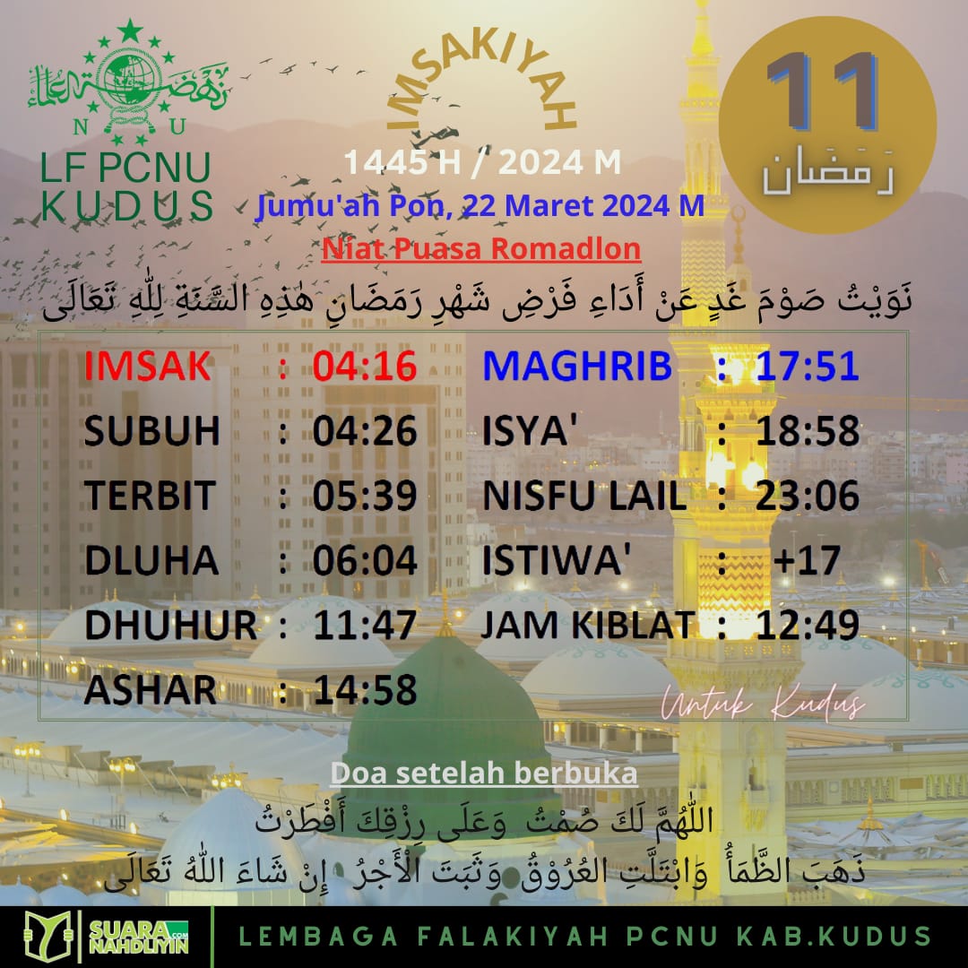 Ramadan Jadwal Imsakiyah untuk Kudus dan Sekitarnya, 11 Ramadan 1445 H 21 March 2024 0 791 Share on Facebook Tweet on Twitter Comments Share this:Click to share on WhatsApp (Opens in new window)Click to share on Facebook (Opens in new window)Click to share on Twitter (Opens in new window)Click to share on Telegram (Opens in new window) Related