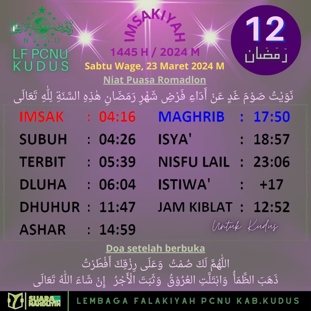 BeritaRamadan Jadwal Imsakiyah untuk Kudus dan Sekitarnya, 12 Ramadan 1445 H 22 March 2024 0 895 Share on Facebook Tweet on Twitter Comments Share this:Click to share on WhatsApp (Opens in new window)Click to share on Facebook (Opens in new window)Click to share on Twitter (Opens in new window)Click to share on Telegram (Opens in new window) Related
