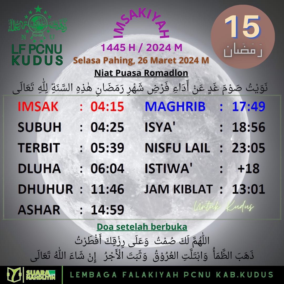 Ramadan Jadwal Imsakiyah untuk Kudus dan Sekitarnya, 15 Ramadan 1445 H 25 March 2024 0 573 Share on Facebook Tweet on Twitter Comments Share this:Click to share on WhatsApp (Opens in new window)Click to share on Facebook (Opens in new window)Click to share on Twitter (Opens in new window)Click to share on Telegram (Opens in new window) Related